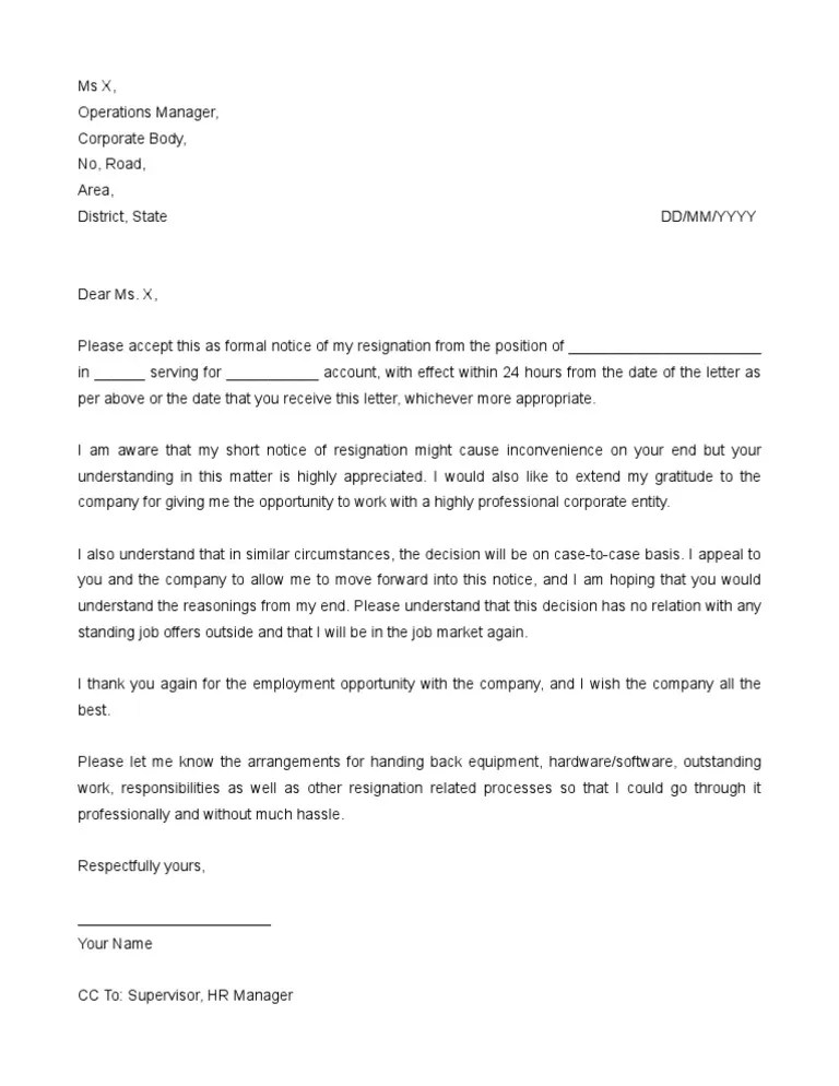 Contoh surat resign malaysia · berikut disertakan contoh surat notis berhenti kerja resignation letter dalam bahasa malaysia untuk panduan semua. If you have to leave a job with only 24 hours notice, here are some tips and guidelines on writing your resignation email or letter, . Therefore, i would like to give . Ada contoh surat resign 24 hours & 1 month notice. Sample resignation letter in malaysia 1. Samada notis 24 jam seminggu 2 minggu sebulan, semak contoh surat rasmi berhenti kerja / resign / perletakan jawatan bahasa melayu .